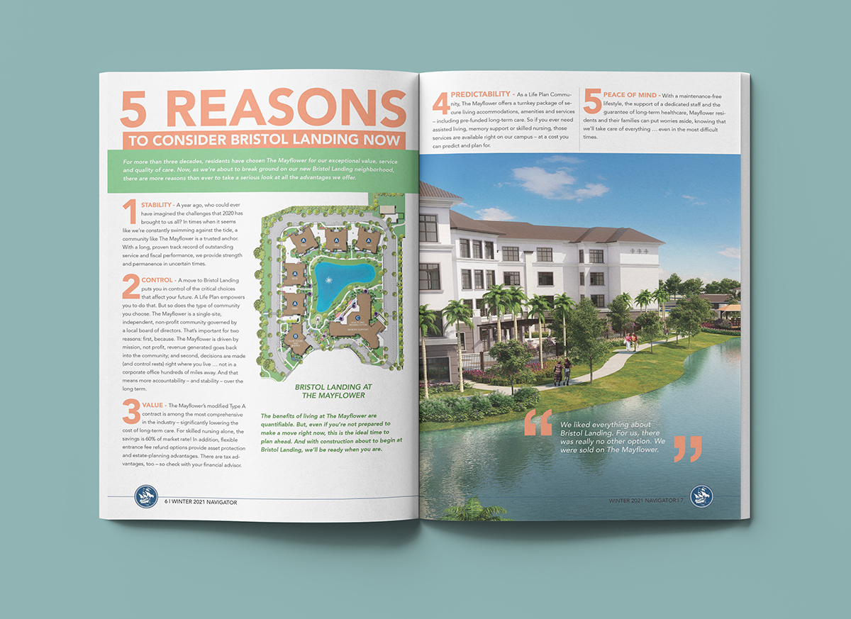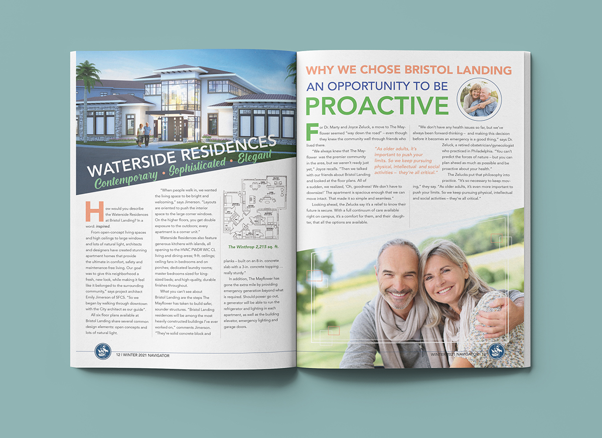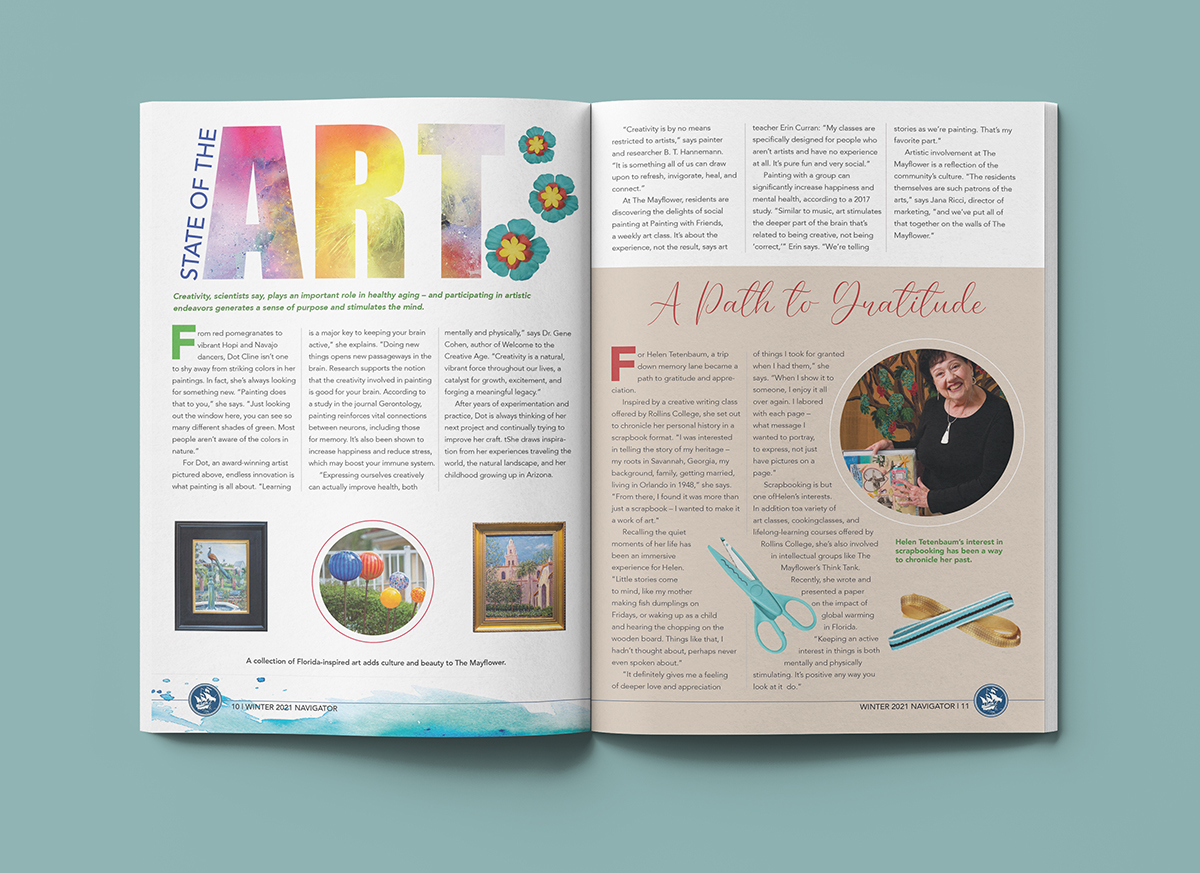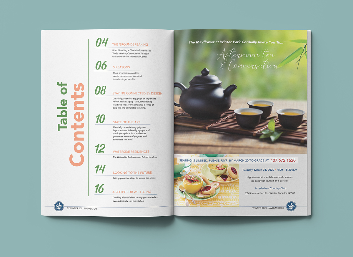 Publication Design • Layout • Copyfitting • Ad Design This project focuses on the design of a promotional magazine for a distinctive senior living community in Winter Park, Florida. The goal is to produce ads and article layouts that will appeal to the target audience. |